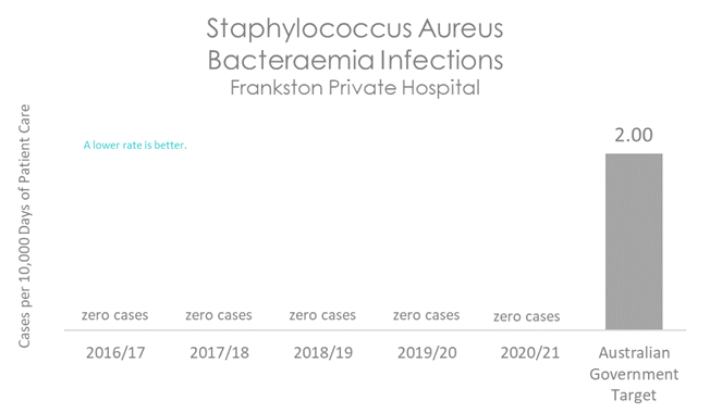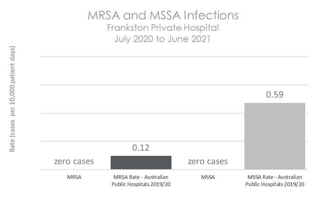 This graph shows that there have been no cases of MSSA or MRSA infections at Frankston Private Hospital during the reporting period.