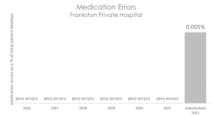This graph shows that there have been no medication errors requiring intervention at Frankston Private Hospital in recent years.