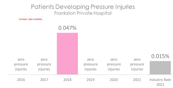 The graph below shows the number patients who have developed a pressure injury during their admission to hospital. The coloured bars represent Frankston Private Hospital's rate. This is compared to the rate of pressure injuries in other Australian hospitals, shown in the grey bar.
