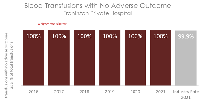 The graph below shows the number of patients at Frankston Private Hospital who had a transfusion with no significant adverse event. The coloured bars represent Frankston Private Hospital's rate. This is compared to the rate of successful transfusion events in other Australian hospitals, shown in the grey bar.