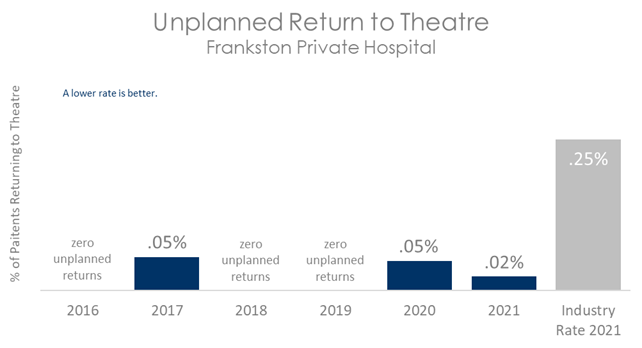 This graph shows that patients undergoing surgery at Frankston Private Hospital have been less likely to have an unplanned return to theatre compared with patients in other Australian hospitals.