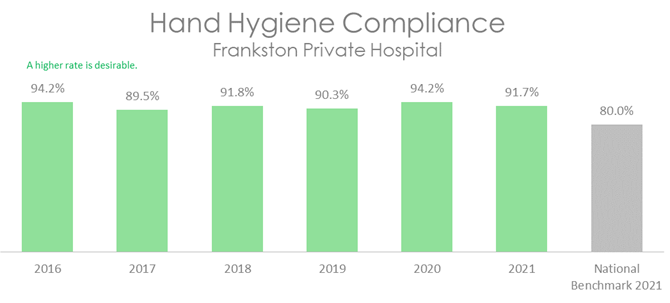 his graph shows that hand hygiene compliance at Frankston Private Hospital has been very high and lies well above the national benchmark.