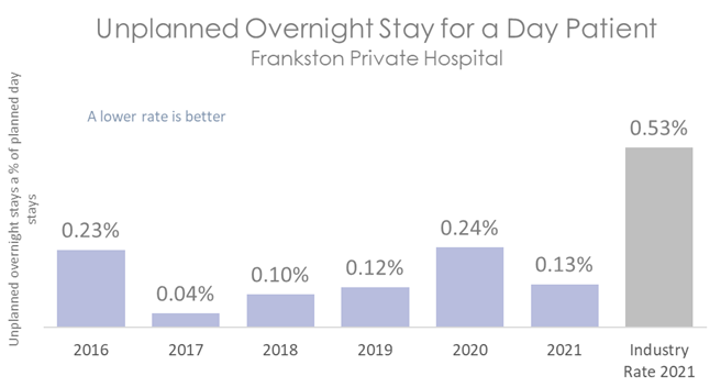 The graph below shows the percentage of day patients who have required an unplanned overnight stay or transfer to another hospital. The coloured bars represent Frankston Private Hospital's rate. This is compared to the rate of unplanned overnight stays in other Australian hospitals, shown in the grey bar.