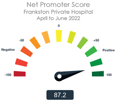 Another key question we ask our patient is “How likely is it that you would recommend Frankston Private Hospital to a family member, friend or colleague?” Patients can rate their response on a scale of 0 (Not at all likely) to 10 (Extremely likely). This allows us to calculate the Net Promoter Score (NPS), which is an index from -100 to +100.