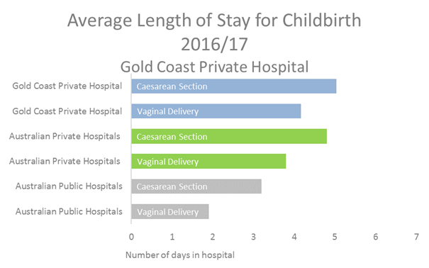 The graph below shows the average length of stay for childbirth at Gold Coast Private Hospital. The length of stay in other Australian private and public hospitals is also shown.
