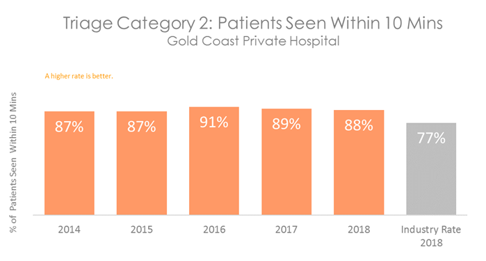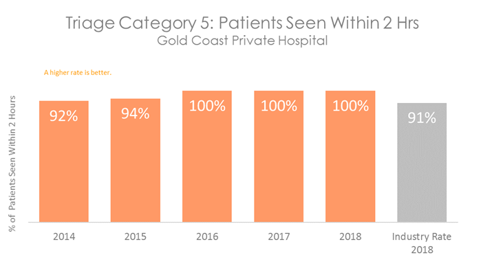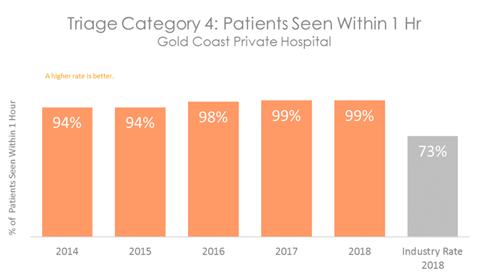 Patients who are in categories 1, 2 or 3 will be seen before categories 4 and 5, even if they arrive in the department at a later time. All hospitals with Emergency Departments measure how quickly patients are attended to. The graphs below show the percentage of patients in each category who are seen within the recommended time. They show that on average, patients visiting the Emergency Department at Gold Coast Private Hospital are attended to more quickly than patients in other Australian hospitals.