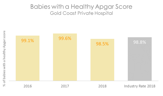 This graph shows that in recent years, the percentage of babies born with a healthy Apgar score at Gold Coast Private Hospital has been similar to other Australian hospitals.