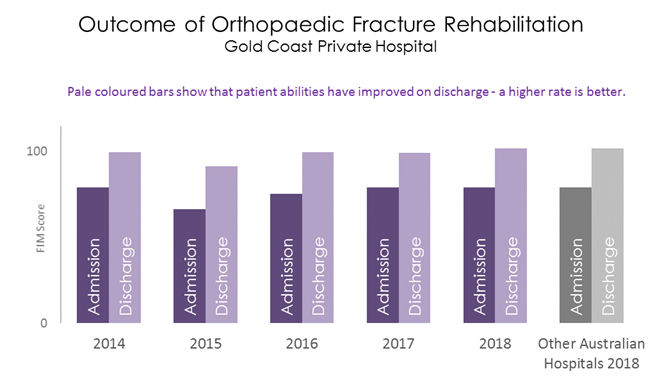 The graph below shows the improvement in patients after rehabilitation for a fractured bone. The dark coloured bars represent patients' abilities on admission to Gold Coast Private Hospital. The pale coloured bars show patients' abilities on discharge. This is compared to the outcomes in other Australian hospitals, shown in the grey bar.