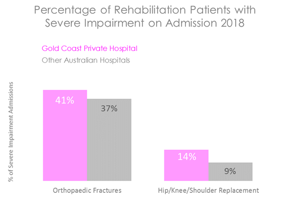 This chart shows that fewer patients at Gold Coast Private Hospital have severe impairments on admission than in other Australian private hospitals.