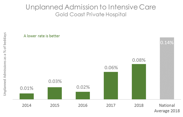 This graph shows that in recent years, patients admitted to Gold Coast Private Hospital have been more likely to have an unplanned admission to Intensive Care compared with patients in other Australian hospitals.