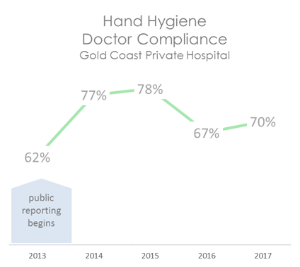 This graph below shows that doctor hand hygiene rates have been variable since we introduced public reporting on this website.