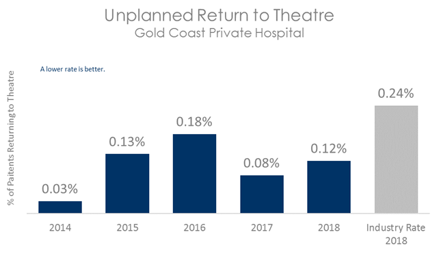 This graph shows that in recent years, patients undergoing surgery at Gold Coast Private Hospital have been less likely to have an unplanned return to theatre compared with patients in other Australian hospitals.