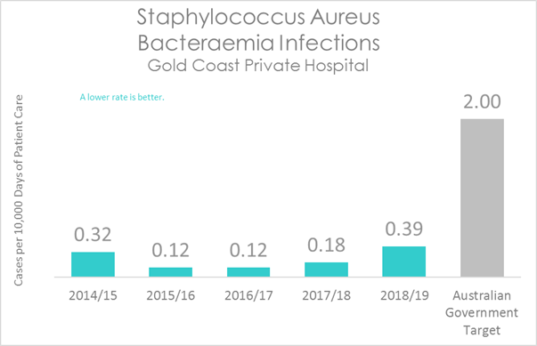 The graph below shows the number of Staphylococcus Aureus infections. The coloured bars represent Gold Coast Private Hospital's rate. This is compared to the Australian government target shown in the grey bar. The national benchmark for SAB is no more than 1 case per 10,000 days of patient care.