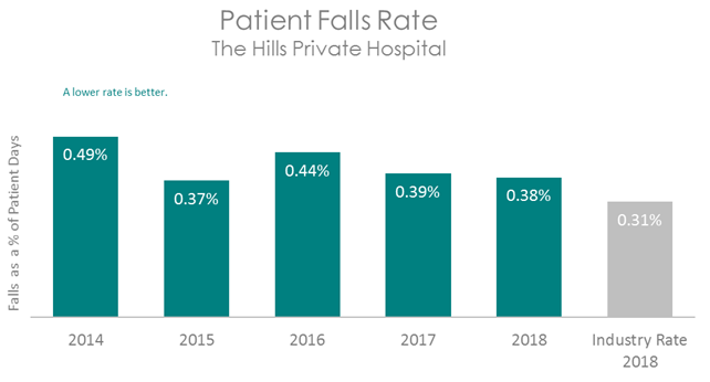 The graph below shows the percentage of patients who have had a fall. The coloured bars represent The Hills Private Hospital's rate. This is compared to the rate of falls at other Australian hospitals, shown in the grey bar.