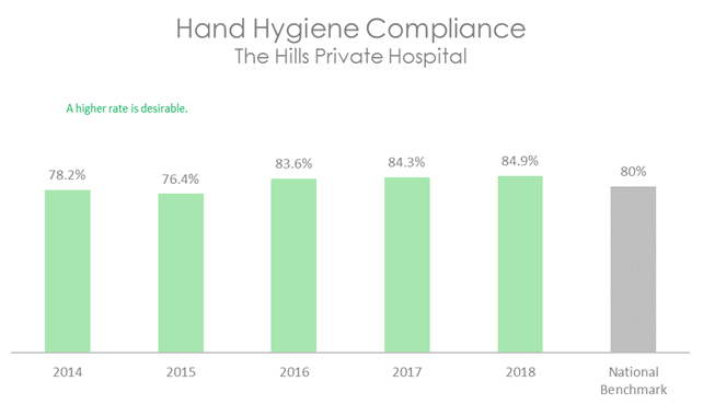This graph shows that hand hygiene compliance at The Hills Private Hospital lies above the national benchmark.
