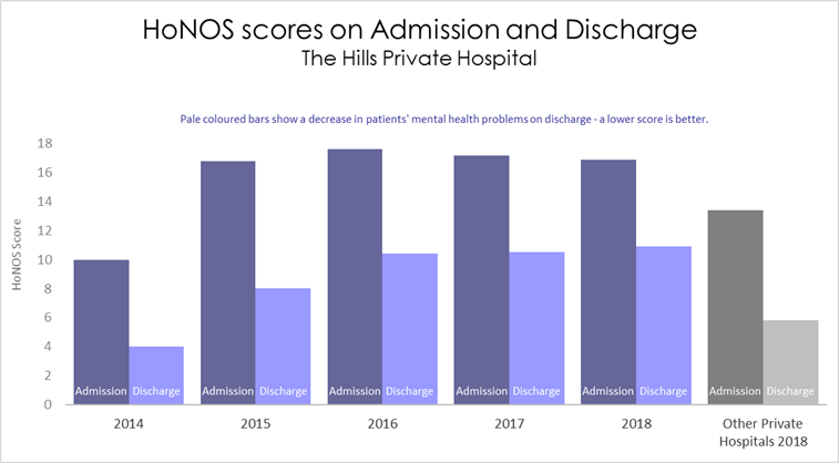 At The Hills Private Hospital, we measure the mental health of patients on admission and again on discharge, to see how they are improving. We use the internationally recognised HoNOS (Health of the Nation Outcome Scales), a tool which allows clinicians to assess various aspects of a patient's mental health, such as depression, anxiety or problematic behaviour.