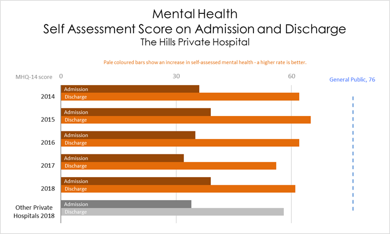 This graph shows that patients feel that their mental health has improved after treatment. Patients at The Hills Private Hospital achieve improvement similar to patients at other other Australian private mental health facilities.