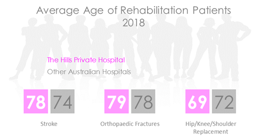 This chart shows that patients at The Hills Private Hospital with strokes or fractures are slightly older on average than patients in other Australian hospitals. Patients who have undergone joint replacements are younger.