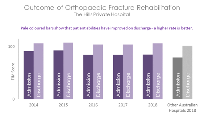 The graph below shows the improvement in patients after rehabilitation for a fractured bone. The dark coloured bars represent patients' abilities on admission to The Hills Private Hospital. The pale coloured bars represent patients' abilities on discharge. This is compared to the outcomes at other Australian hospitals, shown in the grey bars.