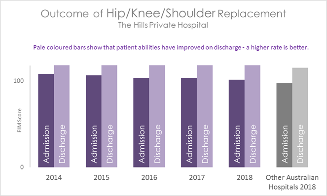 The graph below shows the improvement in patients after rehabilitation for a joint replacement. The dark coloured bars represent patients' abilities on admission to The Hills Private Hospital. The pale coloured bars represent patients' abilities on discharge. This is compared to the outcomes at other Australian hospitals, shown in the grey bars.