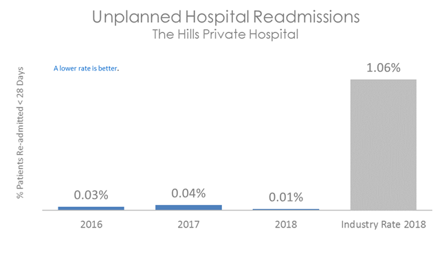 This graph shows that patients admitted to The Hills Private Hospital are less likely to have an unplanned readmission compared with patients in other Australian hospitals.