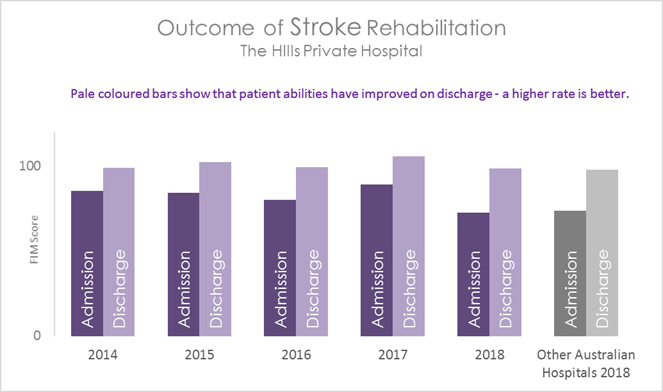 This graph shows that stroke rehabilitation patients at The Hills Private Hospital achieve outcomes similar to patients in other Australian private hospitals.