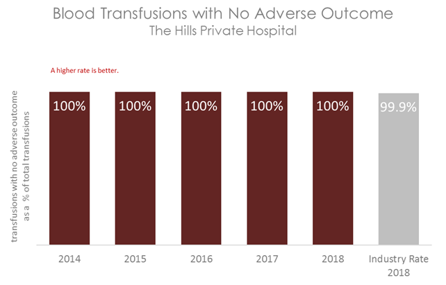 The graph below shows the number of patients who had a transfusion with no significant adverse event. The coloured bars represent The Hills Private Hospital's rate. This is compared to the rate of successful transfusion events in other Australian hospitals, shown in the grey bar.