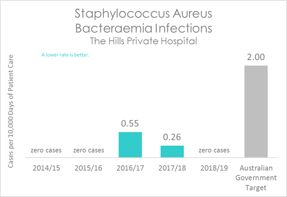 The graph below shows the number of Staphylococcus Aureus infections. The coloured bars represent The Hills Private Hospital's rate. This is compared to the Australian government target shown in the grey bar. The national benchmark for SAB is no more than 2 cases per 10,000 days of patient care.