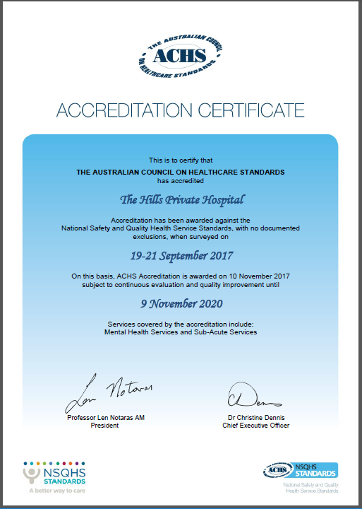 The Hills Private Hospital is fully accredited against the National Safety and Quality Health Service Standards (NSQHSS), a mandatory set of standards established by the Australian Government for all public and private hospitals.