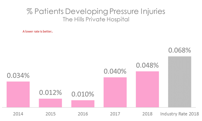 This graph shows that patients at The Hills Private Hospital are less likely to develop a pressure injury than patients in other Australian hospitals.